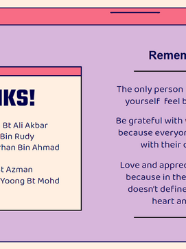 For the reading presentation, we expected it to be presented through Google Meet but ended up, we needed to film ourselves and create at least a 10 minutes video. Sir Afiq asked us to decide our topics a long time ago so that we wouldn't waste our time at the last minute. We chose "Beauty Standard" as our topic. We included the causes, effects, solutions, and many more. We planned to makeover Paan just to show how beauty standards look like nowadays. Besides recording ourselves, we also needed to make some slides and a pamphlet or a brochure as the handouts. I had fun being part of the group which consisted of Naim, Paan, Nurin, and El. We cooperated very well and surprisingly, we didn't have any problems throughout the process which was something that I was grateful for.